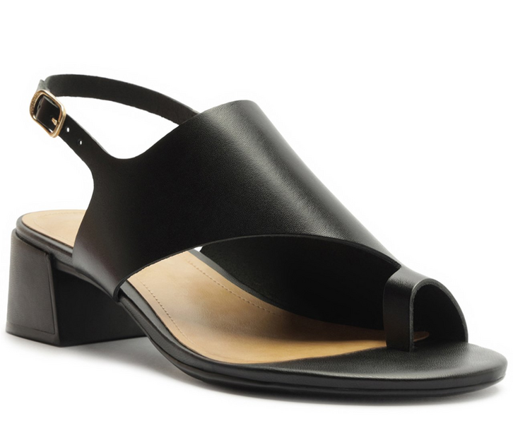 Sandália de salto bloco e tira assimétrica em couro, na cor preta. O modelo possui salto em bloco baixo e apresenta cabedal em tira única assimétrica mais larga - de material similar ao couro, com efeito envernizado. Possui um design imponente de recorte que cobre parte do pé e detalhe que separa o dedão dos demais dedos, com tiras que seguem contornando o calcanhar, presa por uma das laterais, com fecho afivelado lateral. De biqueira moderna quadrada, traz palmilha comfy e assinatura Anacapri em carimbo metálico.