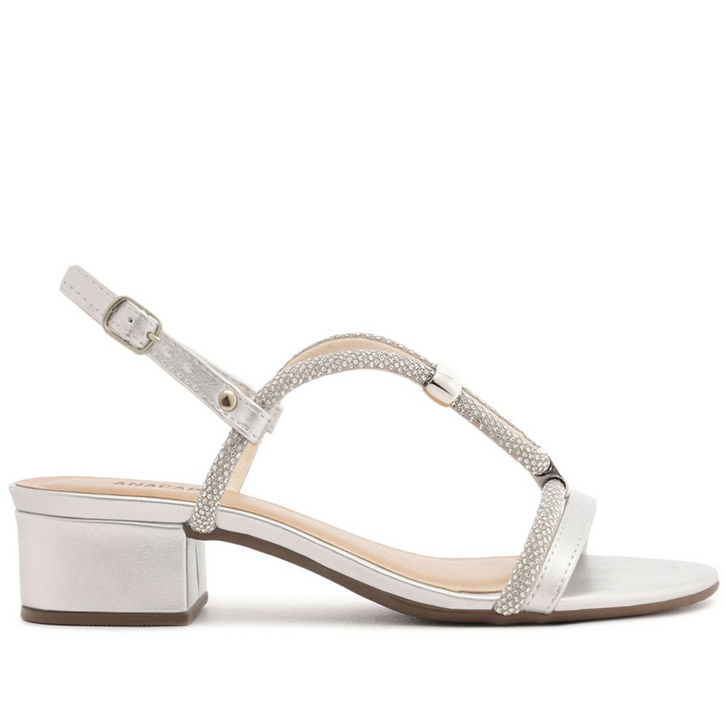 Sandália de salto bloco de multitiras glam, com adorno metálico, na cor prateada. O modelo de material similar ao couro - com detalhe glam em manta brilhosa - apresenta cabedal com design vazado e imponente, com tiras bombadas, presas por tachas metálicas que se unem na parte central da peça - presas nas laterais. Possui uma tira fina bombada traseira, que contorna o calcanhar, com fecho afivelado lateral. De biqueira arredondada, possui salto em bloco baixo, com palmilha acolchoada comfy, no mesmo tom da sandália, com assinatura Anacapri.