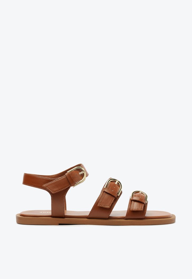 Sandália Elise de três fivelas, na cor marrom. O modelo apresenta cabedal com três tiras largas - uma sobre os dedos, outra sobre o peito de pé e uma que contorna o tornozelo, com detalhe afivelado e metálico nas tiras. De solado rasteiro emborrachado, possui leve saltinho traseiro e traz palmilha comfy de mesmo tom da peça, com assinatura Anacapri.