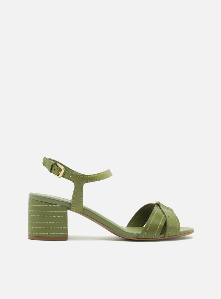 Sandália feminina verde em couro. O sapato tem salto médio bloco, revestido em couro e com costuras, e formato arredondado na ponta. Traz tiras médias em X e com detalhe metálico sobre os dedos. Possui tira em torno do tornozelo que fecha em fivela lateral. Com palmilha da cor da sandália e inscrição do nome da marca.