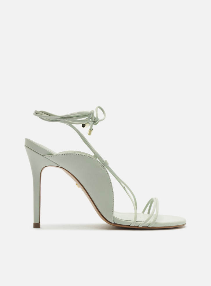 Sandália feminina verde clara. O sapato tem salto alto fino e formato arredondado na ponta. Traz duas tiras finas sobre os dedos e tiras finas que cruzam na parte superior do pé, contornam o tornozelo e fecham em amarração superior. Possui laterais levemente cobertas e palmilha na mesma cor, com inscrição do nome da marca.