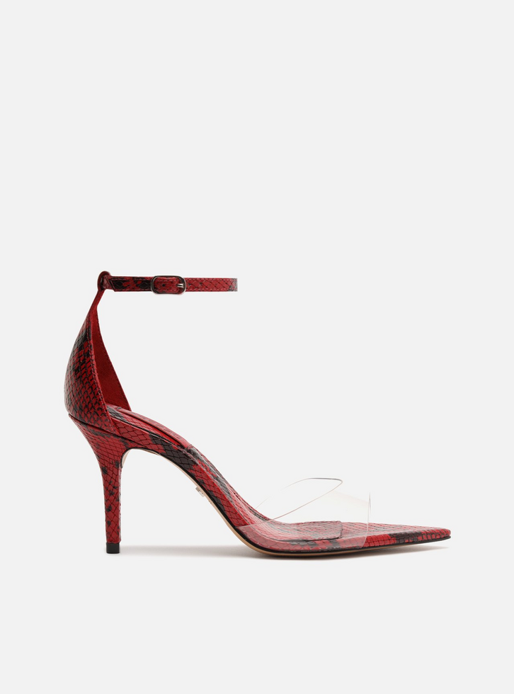 Sandália feminina vermelha. O modelo tem salto médio e bico fino. Traz tira média transparente sobre os dedos. Fechada no calcanhar, possui tira fina em torno do tornozelo com fivela metálica lateral. A sandália exibe todo o peito do pé e os dedos.