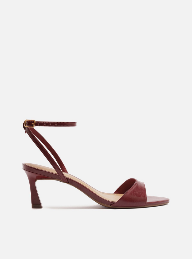 Sandália feminina vermelha. O sapato tem salto médio fino e formato arredondado na ponta. Traz tira média sobre os dedos. Possui tiras finas que saem das laterais, cruzam no calcanhar, contornam o tornozelo e fecham em fivela lateral. Com palmilha bege e inscrição do nome da marca.
