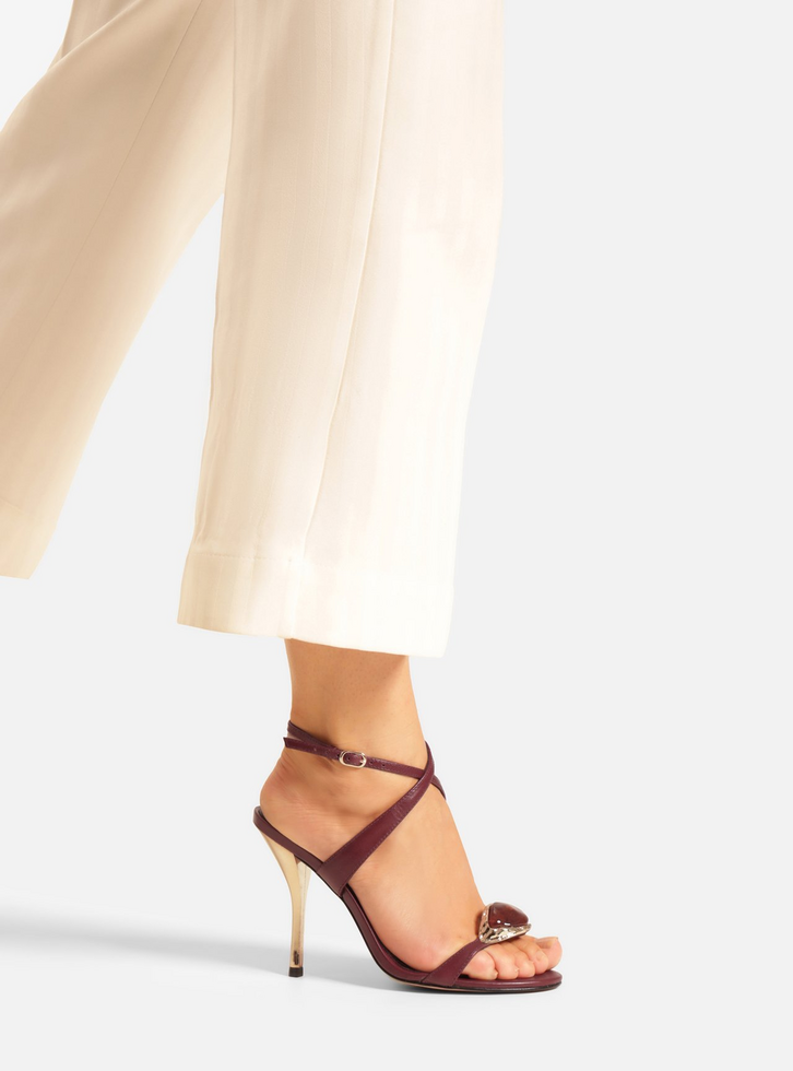 Sandália feminina vinho de couro. O sapato tem salto alto fino dourado e formato arredondado na ponta. Traz tira fina sobre os dedos com aplicação de pedra grande e metal dourado. Possui tiras finas que saem das laterais, cruzam na parte frontal, contornam o tornozelo e fecham em fivela lateral. Com palmilha da cor do modelo e inscrição do nome da marca. A sandália exibe todo o pé.
