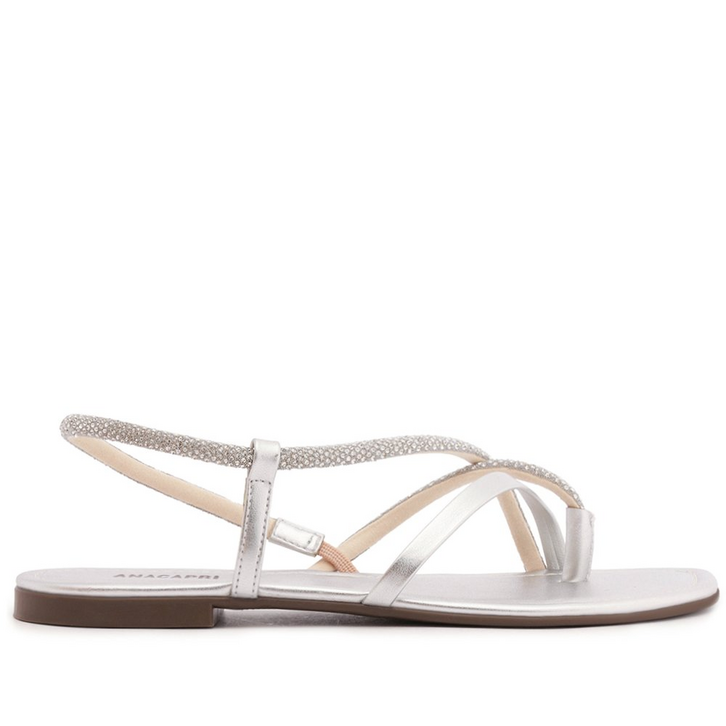 Rasteira glam de tiras assimétricas com encaixe, na cor prateada. O modelo possui solado rasteiro e emborrachado, com leve saltinho traseiro. De biqueira moderna quadrada, apresenta cabedal com detalhe glam em manta brilhosa aplicada nas tiras. O design imponente traz uma tira sobre os dedos e outra sobre o peito de pé. Possui uma tira central elástica que separa os dedos e perpassa pela lateral contornando o calcanhar, presa na lateral oposta, proporcionando o calce de encaixe. Com palmilha acolchoada contornada com pespontos delicados e no mesmo tom da rasteira, com assinatura Anacapri em carimbo metálico.