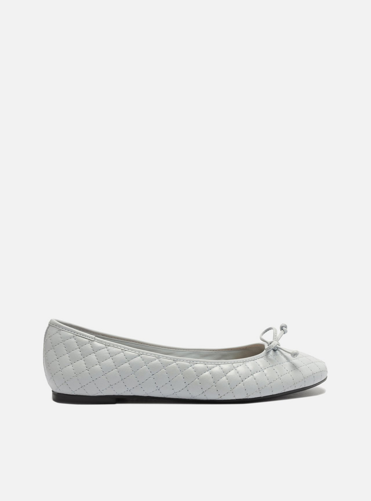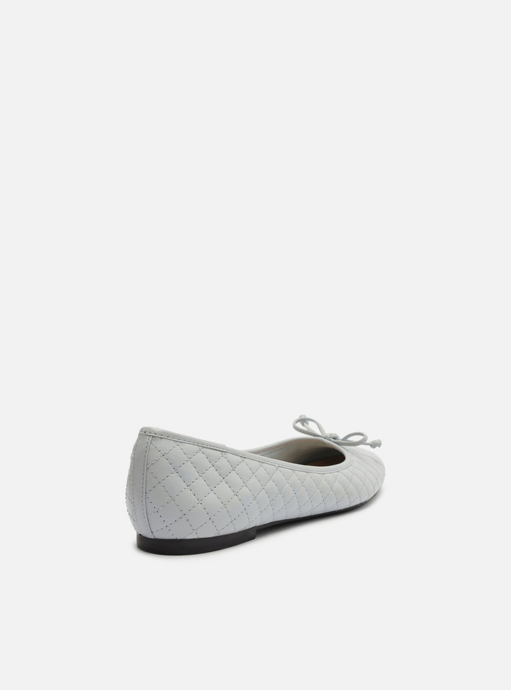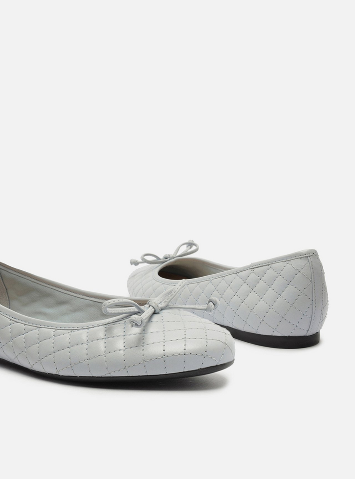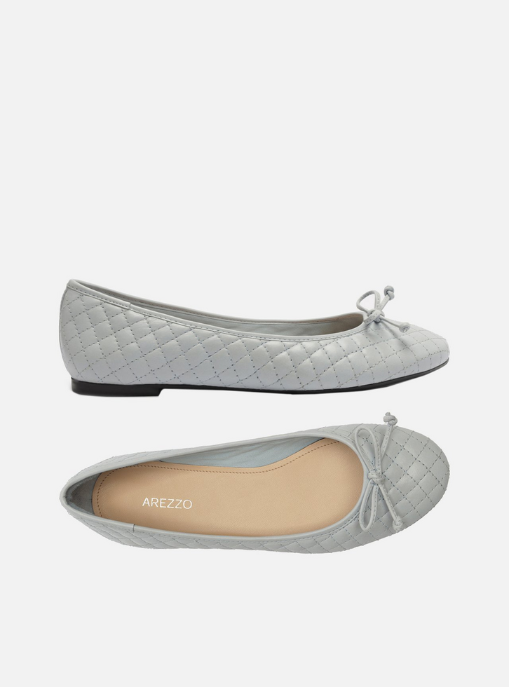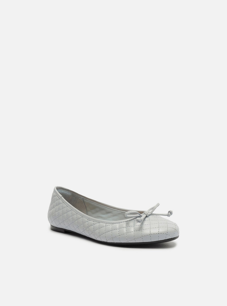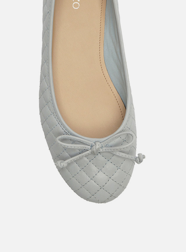 Sapatilha feminina azul bebê. O sapato tem salto rasteiro e formato arredondado na ponta. Traz cabedal em matelassê e recorte arredondado na parte superior do pé. Fechada, possui ainda aplicação de laço pequeno no cabedal. Com palmilha bege e inscrição do nome da marca.