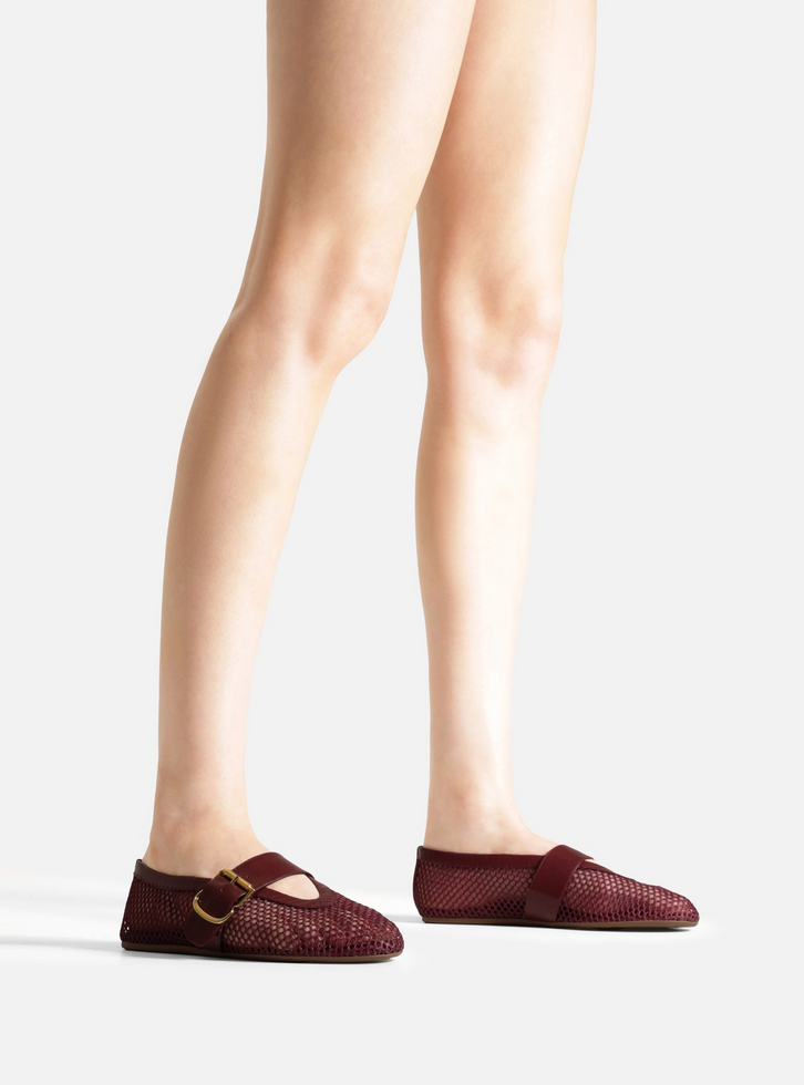 Sapatilha boneca bordô em tela. O sapato é vazado, tem salto rasteiro e formato arredondado na ponta. Fechada, traz recorte em U no cabedal e tira na parte superior do pé com fivela metálica lateral. Com contorno superior liso.
