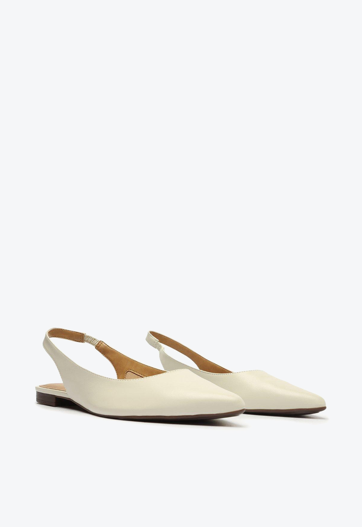 Sapatilha de bico fino branca. Possui slingback no tornozelo deixando o calcanhar à mostra.