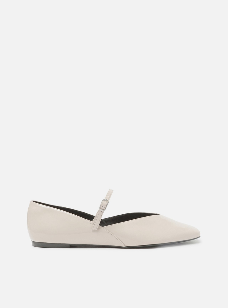 Sapatilha feminina branca em verniz. O sapato tem salto rasteiro e ponta quadrada. Traz cabedal com formato arredondado, tira afivelada sobre o peito do pé e recorte nas laterais. Fechada, exibe toda a parte superior do pé.
