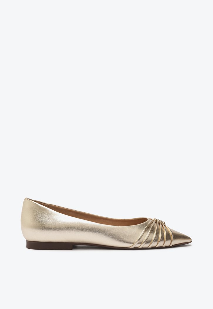 Sapatilha Anacapri de bico fino dourada. O modelo de bico fino traz aplicação de tiras fininhas laterais que se unem em nozinhos delicados na gáspea. Com recorte arredondado no cabedal, o modelo fechado possui solado de borracha marrom com leve elevação no calcanhar e palmilha confortável em nude com assinatura Anacapri.