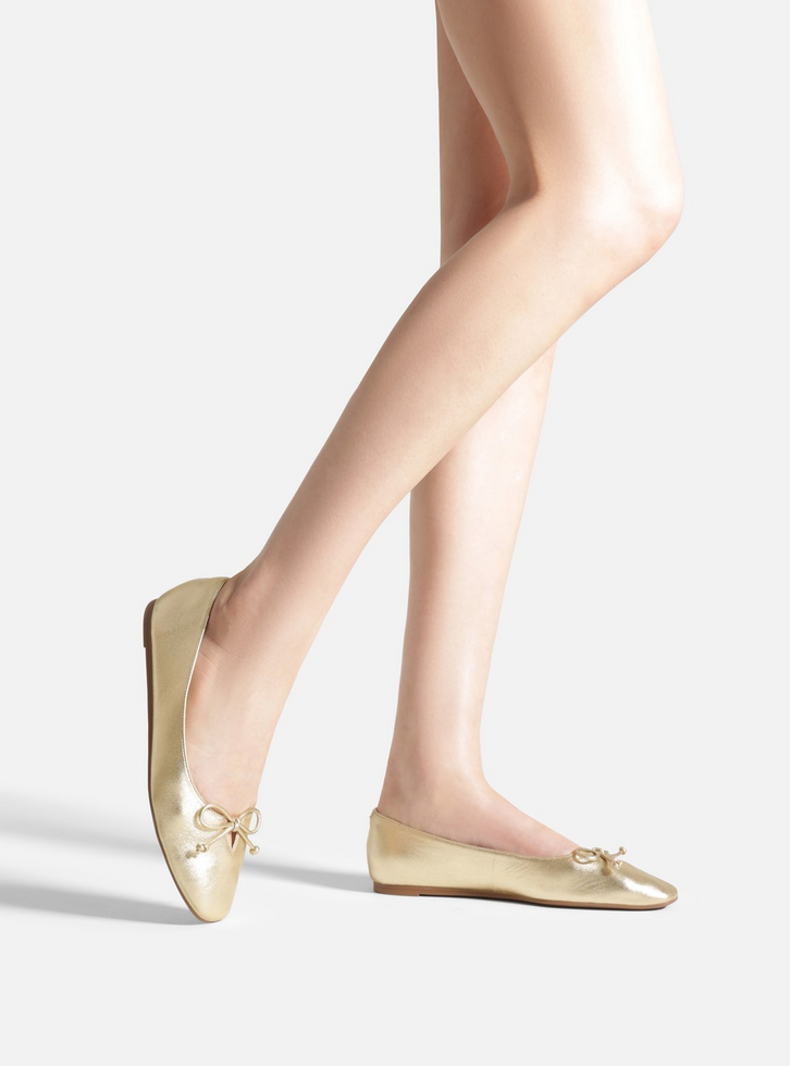 Sapatilha dourada em couro. O sapato tem salto rasteiro e formato arredondado na ponta. Possui cabedal liso com recorte frontal sutil e laço pequeno aplicado na parte superior. Com palmilha bege e inscrição do nome da marca.