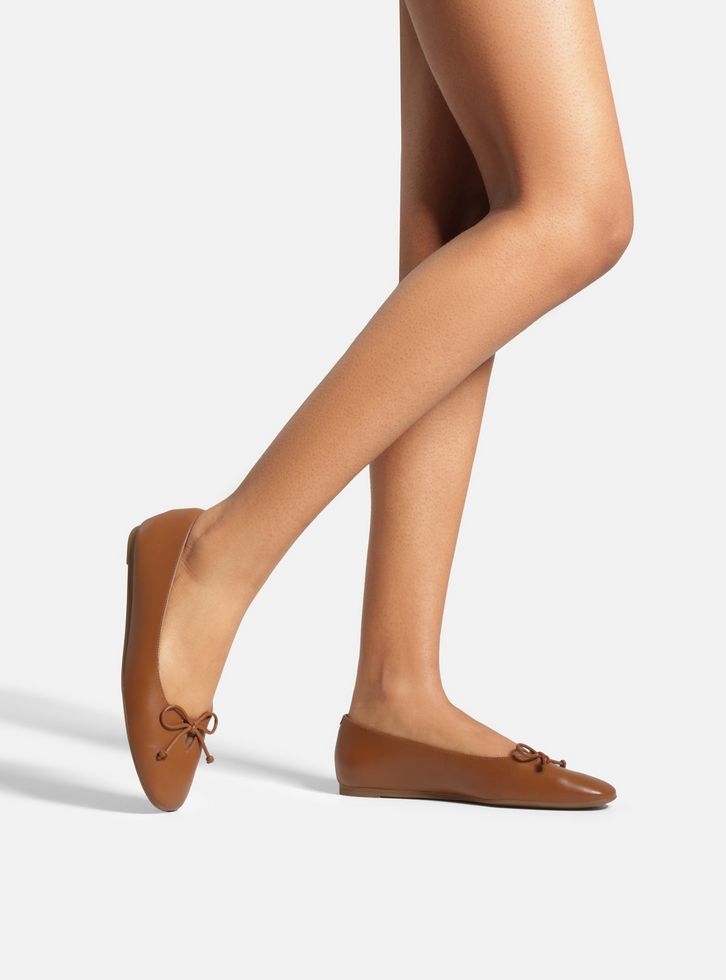 Sapatilha marrom em couro. O sapato tem salto rasteiro e formato arredondado na ponta. Possui cabedal liso com recorte frontal sutil e laço pequeno aplicado na parte superior. Com palmilha bege e inscrição do nome da marca.