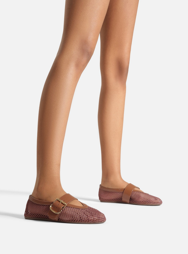 Sapatilha boneca marrom em tela. O sapato é vazado, tem salto rasteiro e formato arredondado na ponta. Fechada, traz recorte em U no cabedal e tira na parte superior do pé com fivela metálica lateral. Com contorno superior liso.