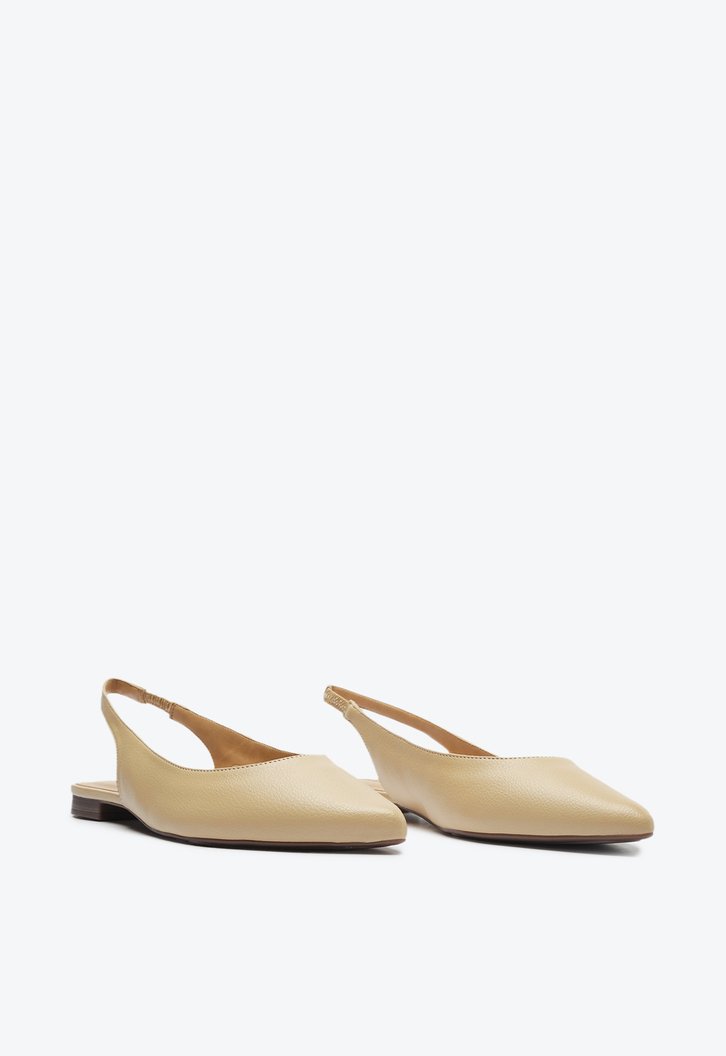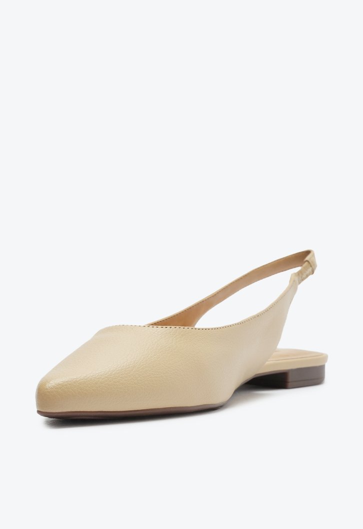 Sapatilha Slingback Bico Fino Bege. O modelo de material similar ao couro possui solado rasteiro com leve saltinho traseiro e bico fino. Estilo slingback - aberta atrás, apresenta recorte arredondado no cabedal. Traz tiras finas conectadas ao cabedal que seguem pelas laterais em elástico, contornando o calcanhar. Com palmilha preta e assinatura Anacapri, a sapatilha deixa o peito do pé e calcanhar à mostra.