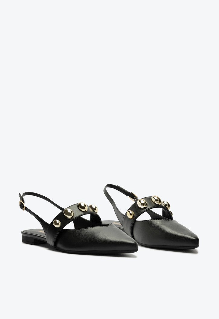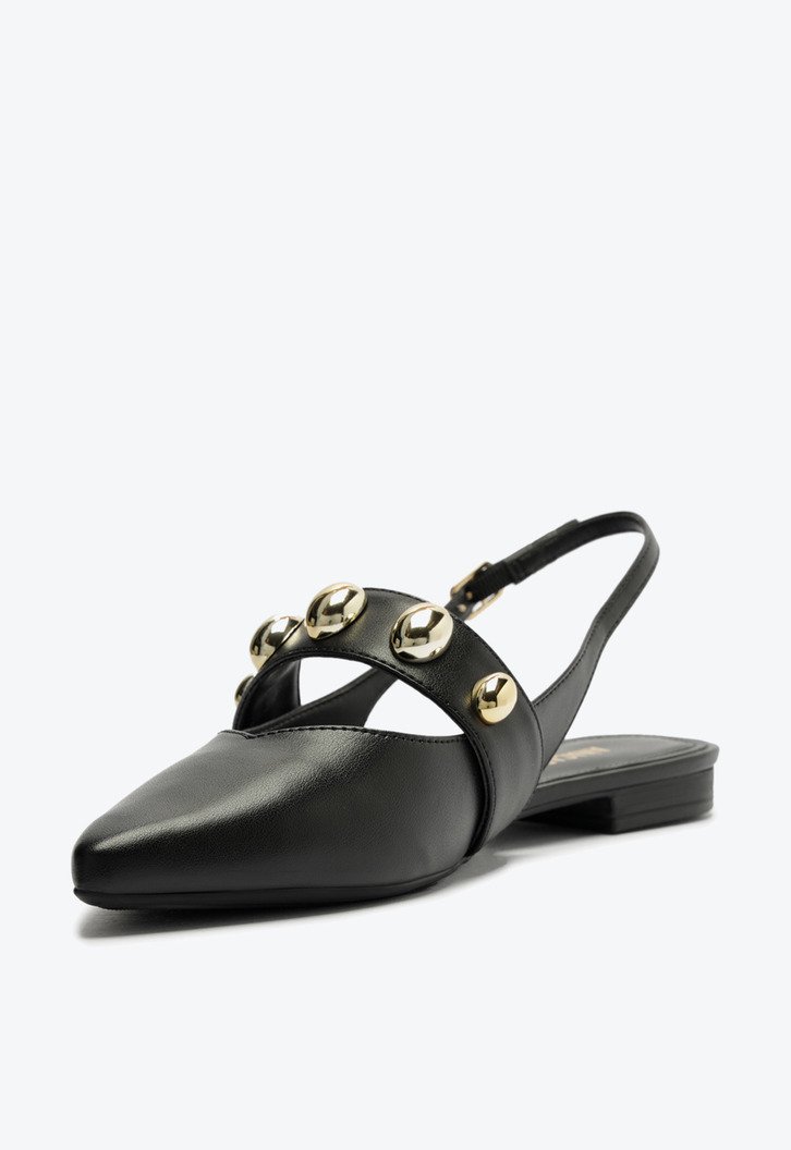 Sapatilha slingback com aplicação de maxi tachas, na cor preta. O modelo de material similar ao couro tem solado emborrachado com leve saltinho. De bico fino, possui recorte moderno em “V” no cabedal e apresenta tira média sobre o peito de pé, com aplicação de maxi tachas metálicas. Estilo slingback - aberta atrás, traz tiras finas conectadas ao cabedal que seguem pelas laterais, contornando o calcanhar, com fecho afivelado regulável. Com palmilha confortável do mesmo tom da sapatilha e assinatura Anacapri, o modelo deixa parte do peito de pé e calcanhar à mostra.