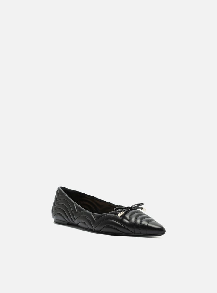 Sapatilha preta. O modelo tem salto rasteiro e bico fino. Traz cabedal em matelassê bombado e recorte arredondado sobre o peito do pé. Fechada, possui ainda aplicação de laço pequeno.