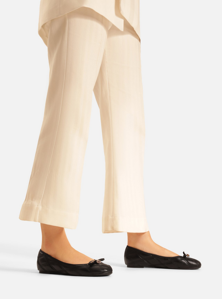 Sapatilha feminina preta . O sapato tem salto rasteiro e formato arredondado na ponta. Traz cabedal em matelassê e recorte arredondado na parte superior do pé. Fechada, possui ainda aplicação de laço pequeno com pingente metálico no cabedal.