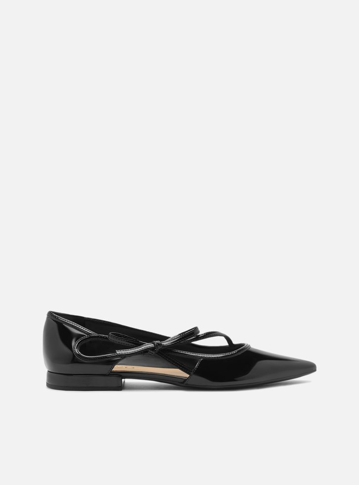 Sapatilha preta. O sapato tem salto mínimo bloco e ponta fina. Possui recorte na lateral externa e aplicação de laço preto envernizado. Traz tira fina conectada ao cabedal, sobre a parte superior do pé que vai até uma das laterais. Com palmilha preta e inscrição do nome da marca.