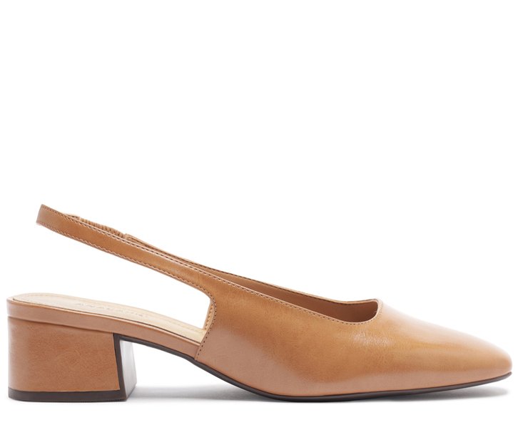 Sapatilha slingback de salto bloco, de ponteira quadrada, na cor bege. O modelo de material similar ao couro possui salto em bloco baixo e biqueira moderna quadrada. Estilo slingback - aberta atrás, apresenta recorte com design quadrado no cabedal. Traz tiras finas conectadas ao cabedal que seguem pelas laterais em elástico, contornando o calcanhar. Com palmilha bege e assinatura Anacapri, a sapatilha deixa o peito do pé e calcanhar à mostra.