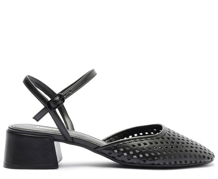 Sapatilha slingback Ana, na cor preta. O modelo de material similar ao couro possui salto em bloco baixo e biqueira arredondada - fechada sobre os dedos, com recorte a laser e detalhe em perfuros delicados. Apresenta tira traseira que contorna o calcanhar, conectada na tira do tornozelo, com fecho lateral afivelado. Com palmilha no mesmo tom da peça e assinatura Anacapri em carimbo metalizado, a sapatilha slingback deixa o peito do pé e calcanhar à mostra.