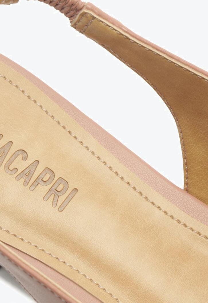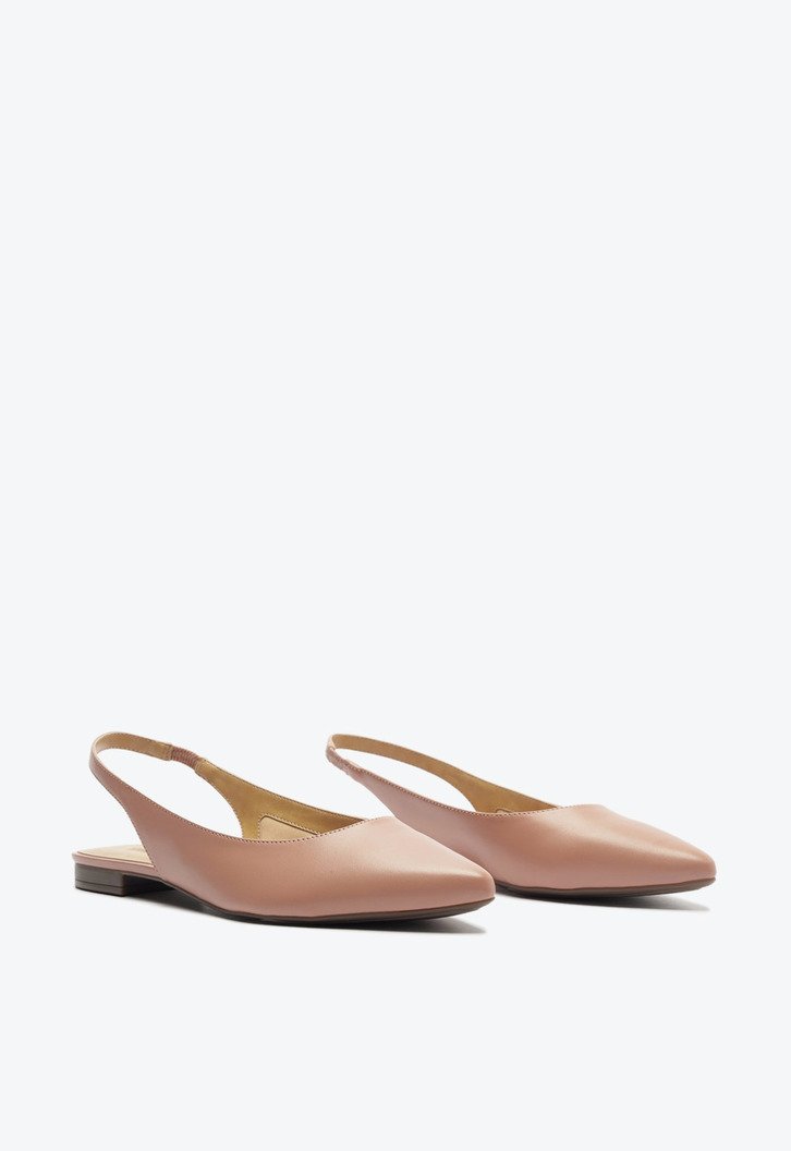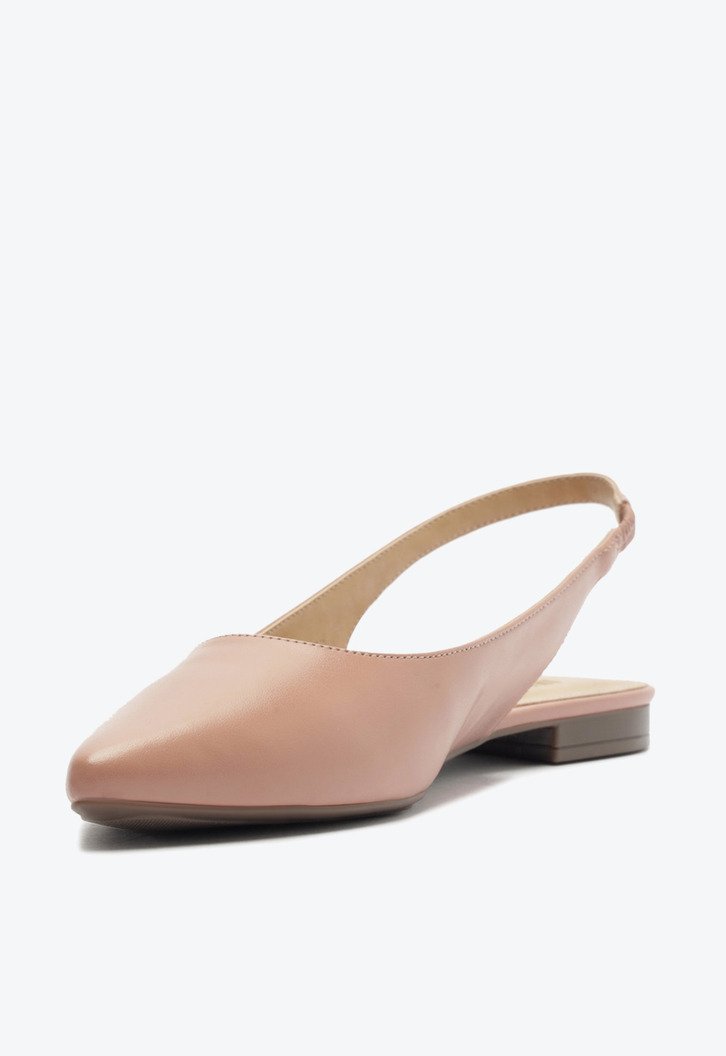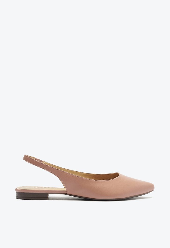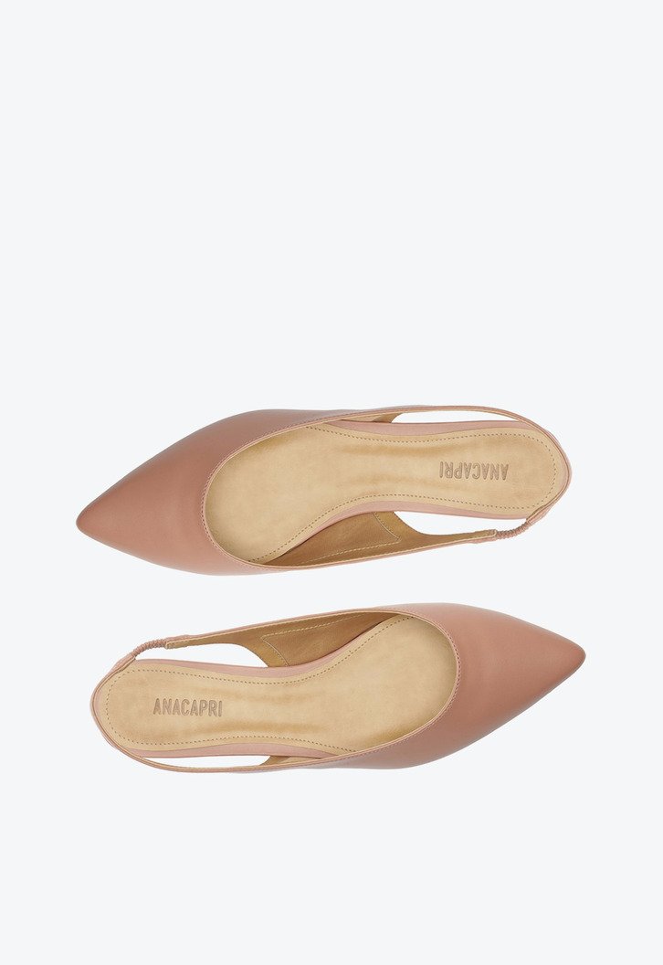 Sapatilha Slingback Bico Fino Rosa. O modelo de material similar ao couro possui solado rasteiro com leve saltinho traseiro e bico fino. Estilo slingback - aberta atrás, apresenta recorte arredondado no cabedal. Traz tiras finas conectadas ao cabedal que seguem pelas laterais em elástico, contornando o calcanhar. Com palmilha bege e assinatura Anacapri, a sapatilha deixa o peito do pé e calcanhar à mostra.