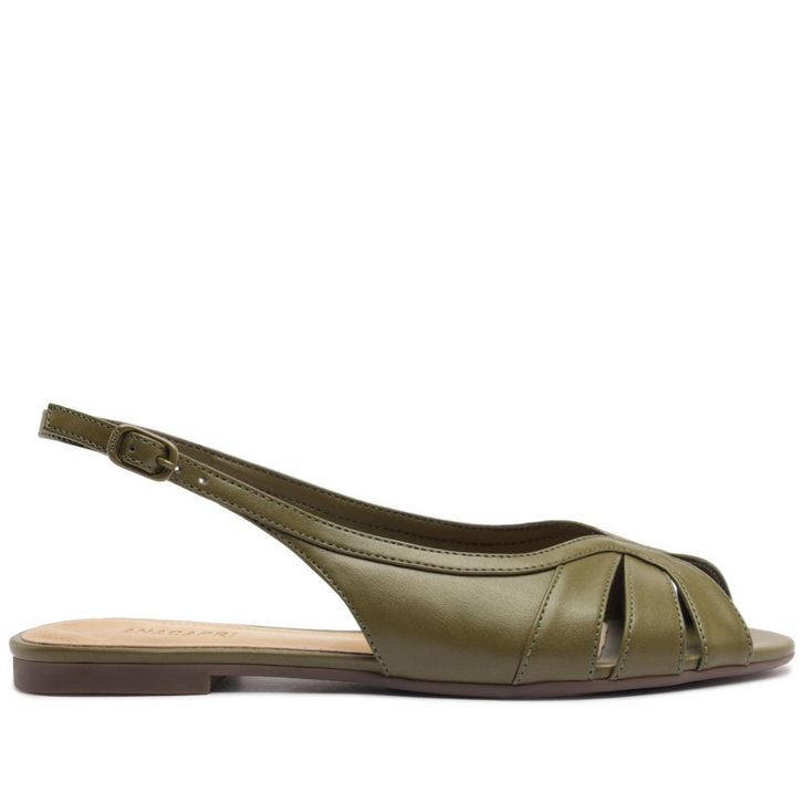 Sapatilha Slingback Destroyed Boho Verde. O modelo peep toe - aberto na parte da frente mostrando os dedos - possui biqueira arredondado com design de recortes vazados em tiras no cabedal. De material similar ao couro, ajustada e com recortes imponentes nas laterais, possui contorno superior em costura pesponto delicado e assinatura Anacapri na palmilha. Com fechamento slingback afivelado na parte traseira, o modelo deixa o peito de pé, calcanhar, laterais e dedos á mostra.