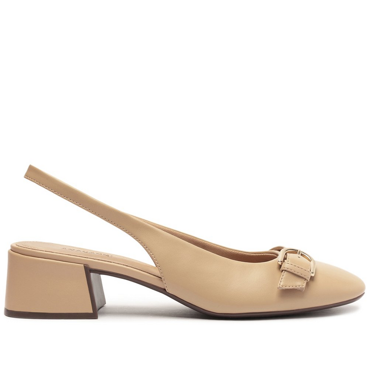Sapatilha slingback Elise, com detalhe em fivela, na cor bege. O modelo de material similar ao couro, possui salto em bloco baixo e biqueira arredondada. Estilo slingback - aberta atrás, apresenta design imponente de recorte no cabedal, com aplicação de tira sobreposta imponente e afivelada na gáspea. Traz tiras conectadas ao cabedal que seguem pelas laterais em elástico, contornando o calcanhar. Com palmilha no mesmo tom da sapatilha e assinatura Anacapri.