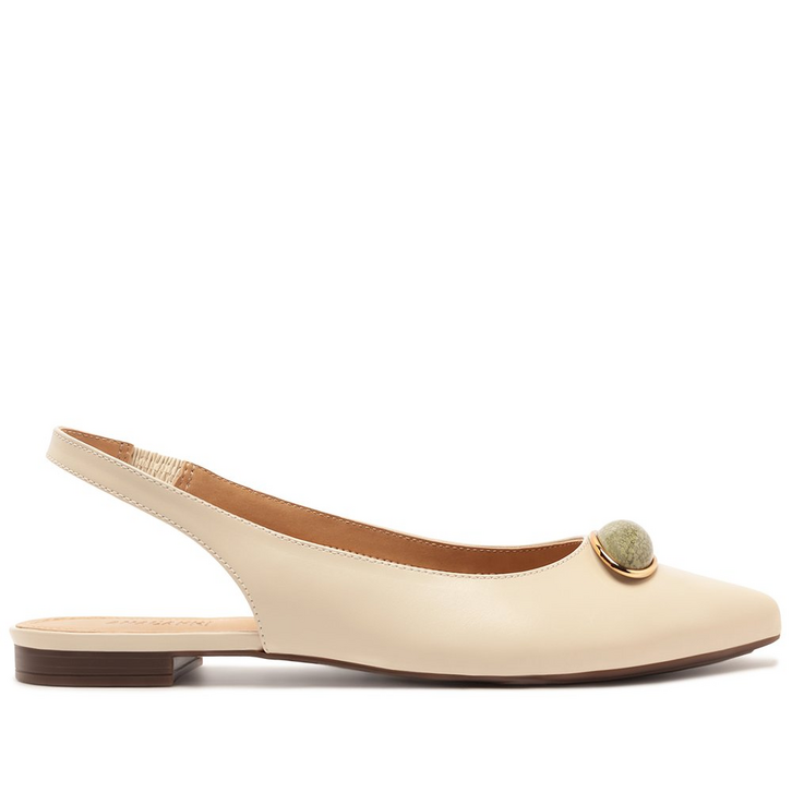 Sapatilha slingback de bico fino, com detalhe em pedraria, na cor branca. O modelo de material similar ao couro possui solado rasteiro emborrachado, com leve saltinho traseiro e bico fino. Estilo slingback - aberta atrás, apresenta recorte arredondado no cabedal, com aplicação de maxi adorno redondo em pedraria colorida, com contorno metálico sobre a gáspea. Traz tiras finas conectadas ao cabedal que seguem pelas laterais em elástico, contornando o calcanhar. Com palmilha bege e assinatura Anacapri, a sapatilha deixa o peito do pé e calcanhar à mostra.