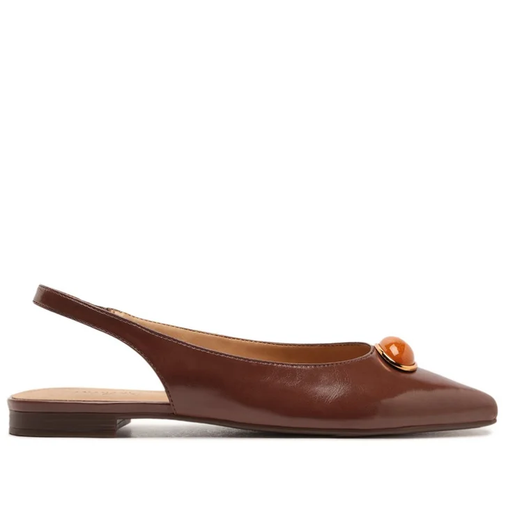 Sapatilha slingback de bico fino, com detalhe em pedraria, na cor marrom. O modelo de material similar ao couro possui solado rasteiro emborrachado, com leve saltinho traseiro e bico fino. Estilo slingback - aberta atrás, apresenta recorte arredondado no cabedal, com aplicação de maxi adorno redondo em pedraria colorida, com contorno metálico sobre a gáspea. Traz tiras finas conectadas ao cabedal que seguem pelas laterais em elástico, contornando o calcanhar. Com palmilha bege e assinatura Anacapri, a sapatilha deixa o peito do pé e calcanhar à mostra.