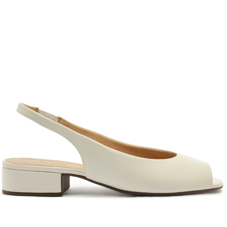 Sapatilha slingback peep toe, na cor branca. O modelo de material similar ao couro, possui salto em bloco baixo e biqueira arredondada. Estilo slingback - aberta atrás, apresenta design imponente de recorte no cabedal, com detalhe frontal aberto - estilo peep toe, deixando parte dos dedos á mostra. Traz tiras conectadas ao cabedal que seguem pelas laterais em elástico, contornando o calcanhar. Com palmilha no mesmo tom da sapatilha e assinatura Anacapri.