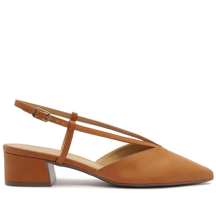 Sapatilha slingback de salto bloco e bico fino, na cor marrom. O modelo, de material similar ao couro, possui salto em bloco baixo e bico fino. Estilo slingback - aberto atrás, apresenta cabedal com tirinhas finas que seguem do centro da gáspea pela pala - presas pelas laterais - e contornam o calcanhar, com fecho afivelado. Com palmilha nude e assinatura Anacapri, a sapatilha deixa o peito do pé e calcanhar à mostra.