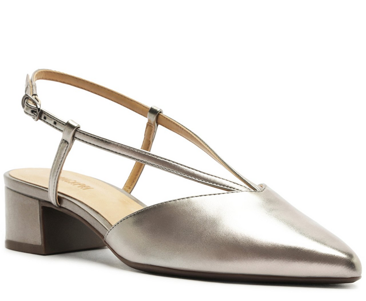 Sapatilha slingback de salto bloco e bico fino, na cor prateada. O modelo, de material similar ao couro, possui salto em bloco baixo e bico fino. Estilo slingback - aberto atrás, apresenta cabedal com tirinhas finas que seguem do centro da gáspea pela pala - presas pelas laterais - e contornam o calcanhar, com fecho afivelado. Com palmilha nude e assinatura Anacapri, a sapatilha deixa o peito do pé e calcanhar à mostra.