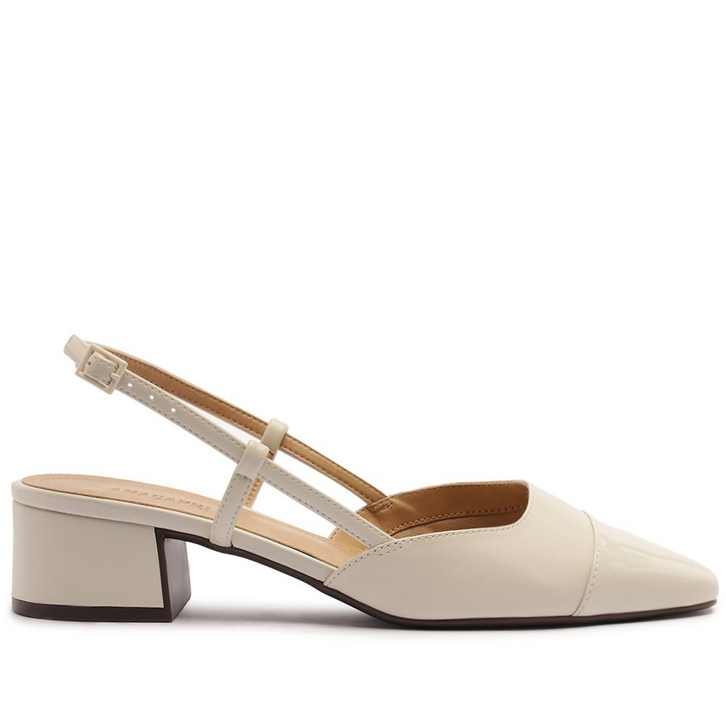 Sapatilha Slingback Salto Bloco Ponta Verniz Branca. De salto em bloco baixo e bico quadrado, traz cabedal com recorte reto sobre o peito do pé, formato ajustado nas laterais e biqueira preta em verniz. Aberta atrás, possui tiras finas conectadas ao cabedal presas pelas laterais, que contornam o calcanhar com fecho em fivela ajustável. Com palmilha bege e assinatura Anacapri. O modelo deixa o peito de pé e calcanhar à mostra.
