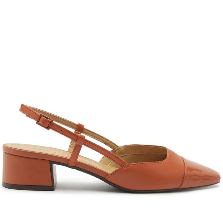 Sapatilha Slingback Salto Bloco Ponta Verniz marrom. De salto em bloco baixo e bico quadrado, traz cabedal com recorte reto sobre o peito do pé, formato ajustado nas laterais e biqueira preta em verniz. Aberta atrás, possui tiras finas conectadas ao cabedal presas pelas laterais, que contornam o calcanhar com fecho em fivela ajustável. Com palmilha preta e assinatura Anacapri. O modelo deixa o peito de pé e calcanhar á mostra.