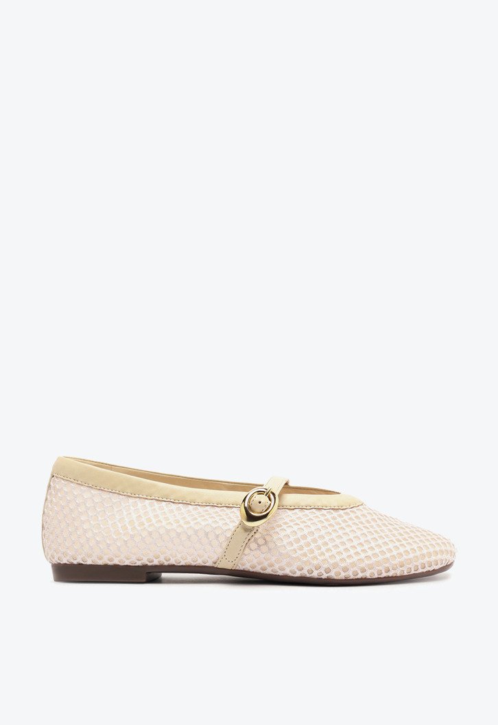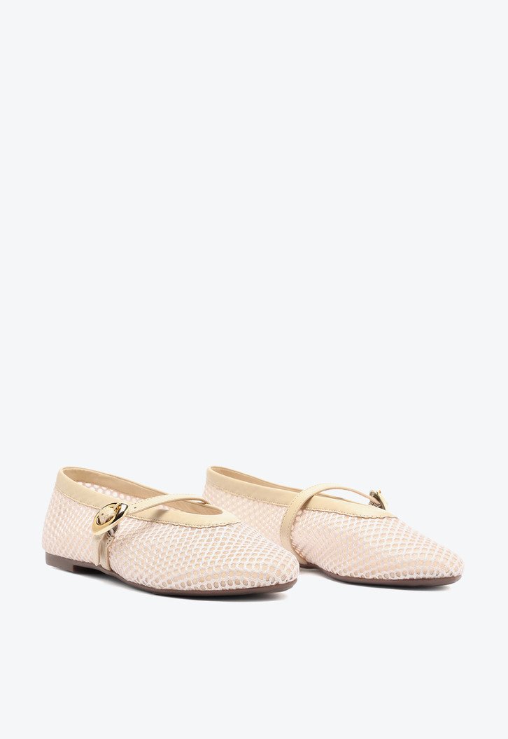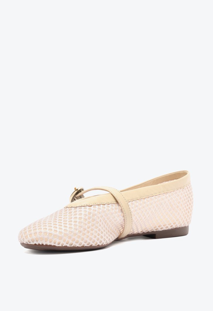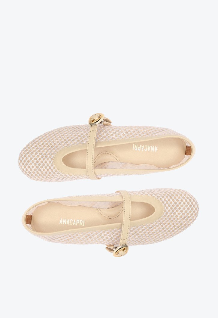 Sapatilha Brigitte em tela, na cor bege. O modelo - estilo boneca - possui solado rasteiro e emborrachado com leve saltinho traseiro e biqueira arredondada. Traz cabedal em tela transparente com efeito tramado, recorte arredondado sobre o peito de pé e contorno em fita no mesmo tom da peça. Fechada, traz tira média afivelada - redonda e metálica - com regulagem sobre o peito do pé. Com palmilha confortável e assinatura Anacapri.