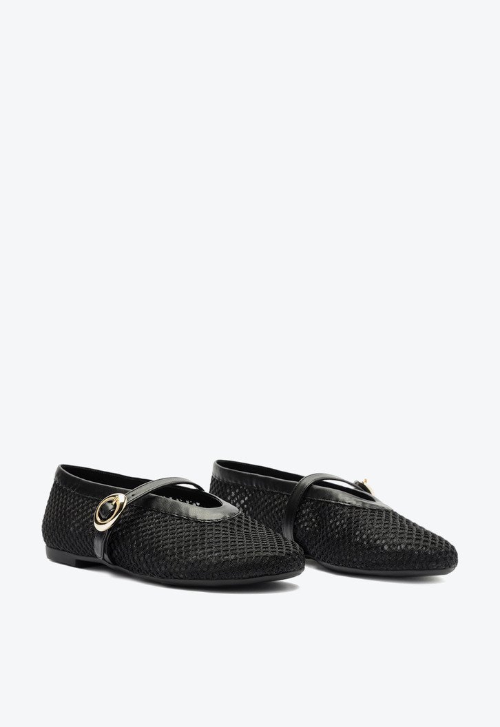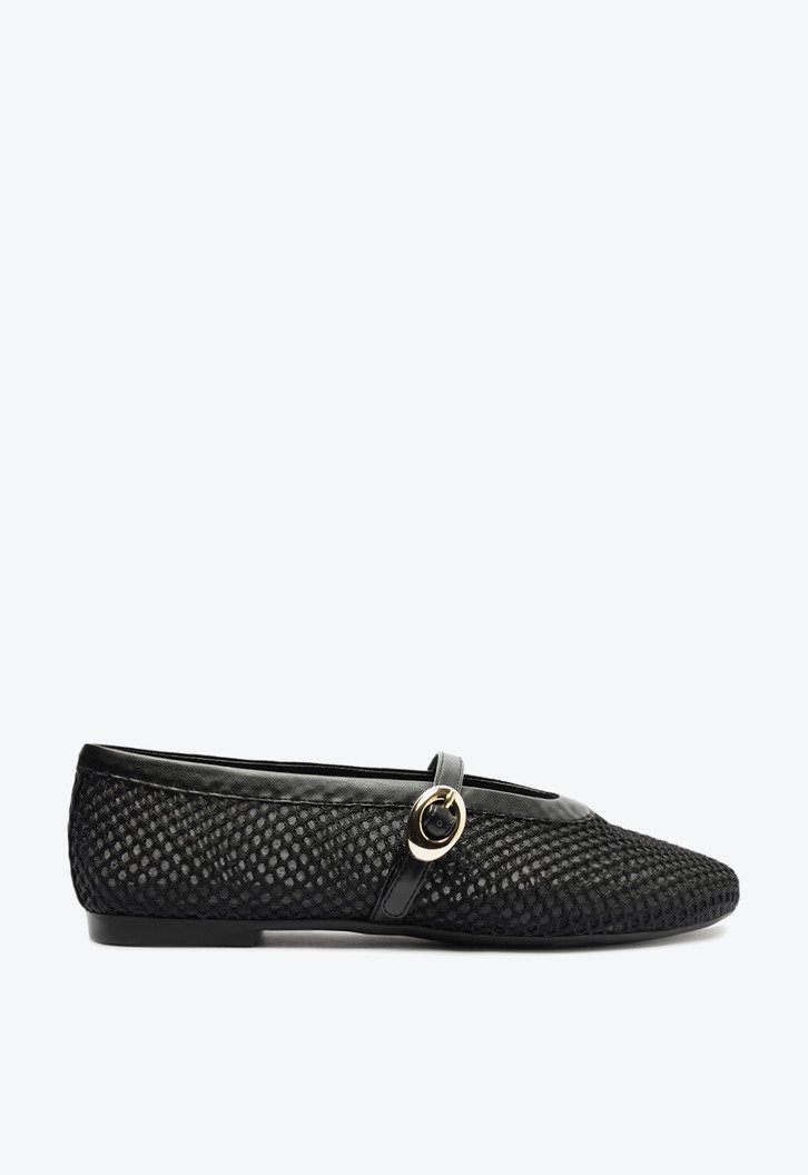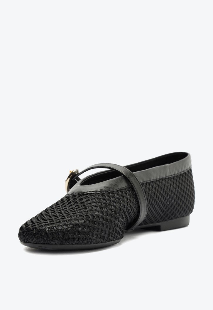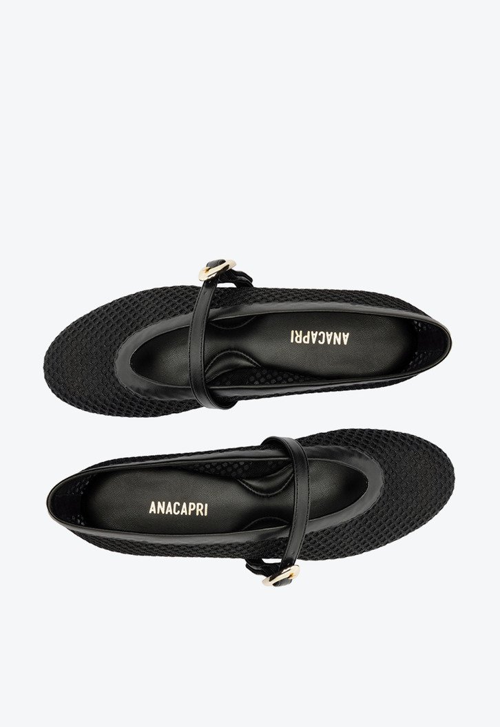 Sapatilha Brigitte em tela, na cor preta. O modelo - estilo boneca - possui solado rasteiro e emborrachado com leve saltinho traseiro e biqueira arredondada. Traz cabedal em tela transparente com efeito tramado, recorte arredondado sobre o peito de pé e contorno em fita no mesmo tom da peça. Fechada, traz tira média afivelada - redonda e metálica - com regulagem sobre o peito do pé. Com palmilha confortável e assinatura Anacapri.