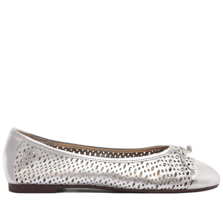 Sapatilha com detalhe de recortes e aplicação de laço, na cor prateada. O modelo de material similar ao couro possui solado rasteiro emborrachado, com leve saltinho traseiro e biqueira arredondada. Fechada, apresenta cabedal vazado, com recorte a laser e detalhe em perfuros delicados. Com aplicação de lacinho na gáspea e palmilha no mesmo tom da peça, com assinatura Anacapri.