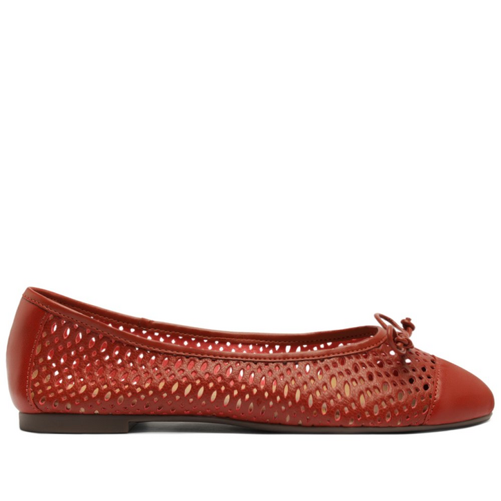 Sapatilha com detalhe de recortes e aplicação de laço, na cor vermelha. O modelo de material similar ao couro possui solado rasteiro emborrachado, com leve saltinho traseiro e biqueira arredondada. Fechada, apresenta cabedal vazado, com recorte a laser e detalhe em perfuros delicados. Com aplicação de lacinho na gáspea e palmilha no mesmo tom da peça, com assinatura Anacapri.