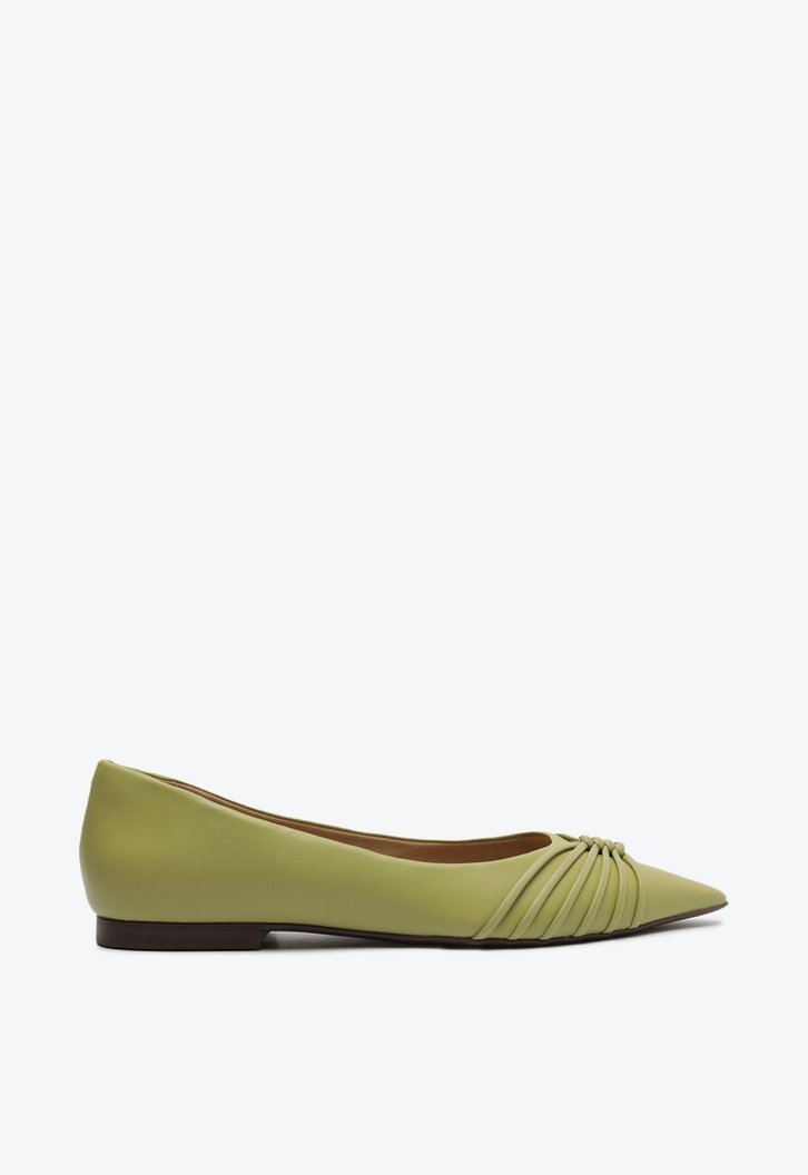 Sapatilha Anacapri de bico fino verde. O modelo de bico fino traz aplicação de tiras fininhas laterais que se unem em nozinhos delicados na gáspea. Com recorte arredondado no cabedal, o modelo fechado possui solado de borracha marrom com leve elevação no calcanhar e palmilha confortável em nude com assinatura Anacapri.