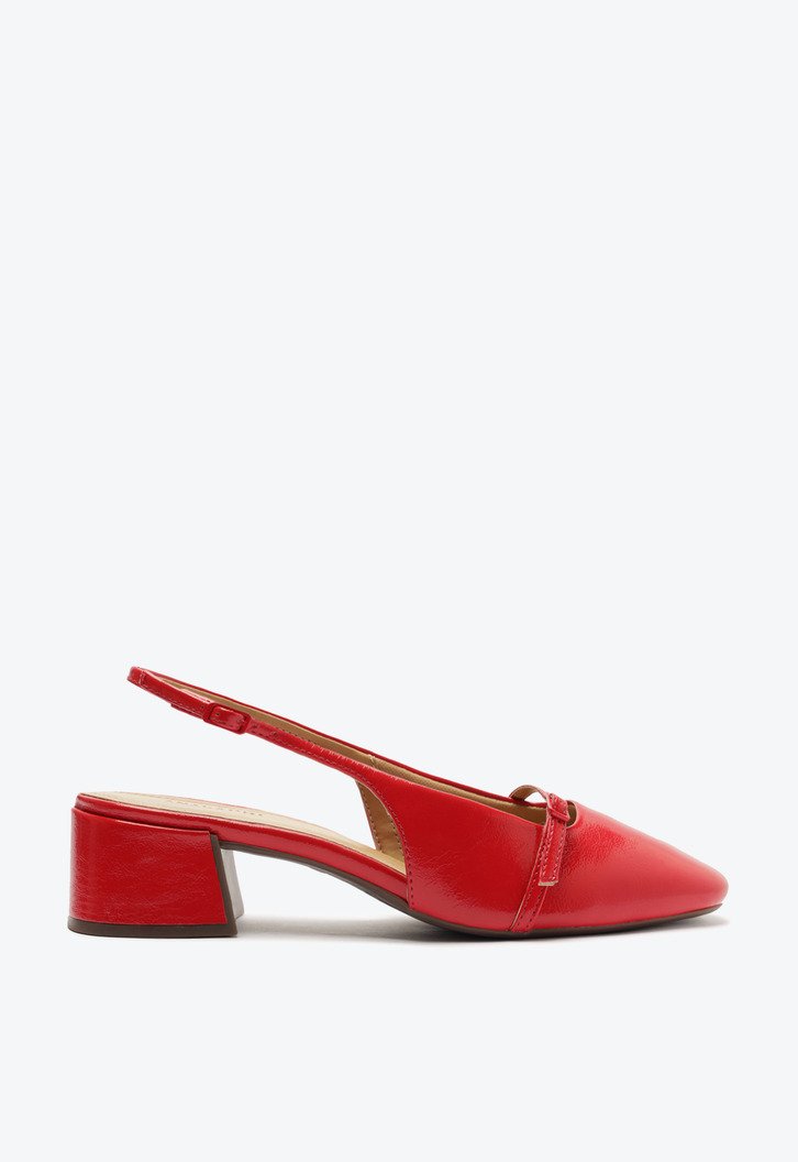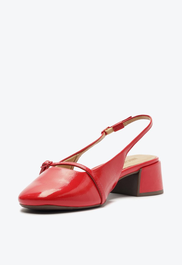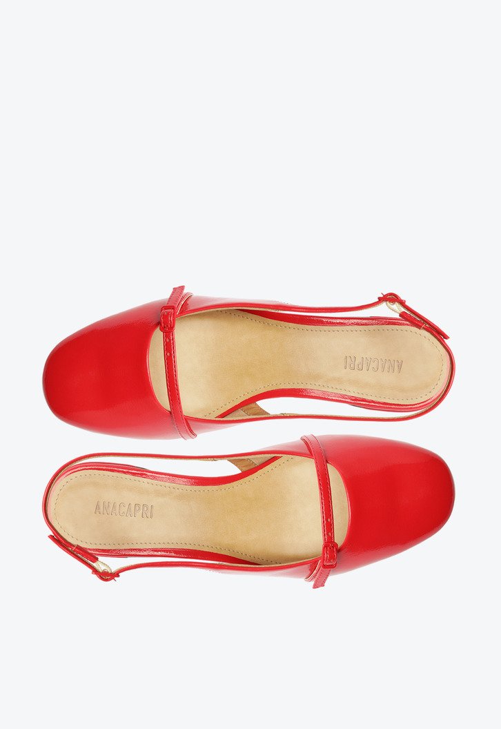Sapatilha Boneca New Milena Verniz Vermelha. De salto em bloco baixo e biqueira quadrada, traz cabedal com recorte reto sobre o peito do pé, formato ajustado nas laterais e acabamento envernizado. Aberta atrás estilo slingback, possui tiras finas conectadas ao cabedal que seguem pelas laterais contornando o calcanhar, com fechamento afivelado lateral. O modelo traz detalhe em tirinha fina presa na lateral com fecho em fivela metálica ajustável. Com nova palmilha nude e assinatura Anacapri.