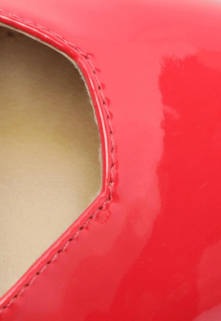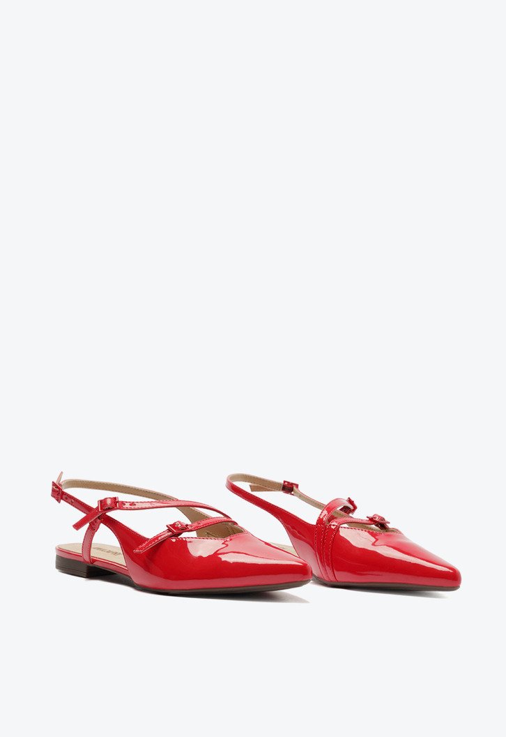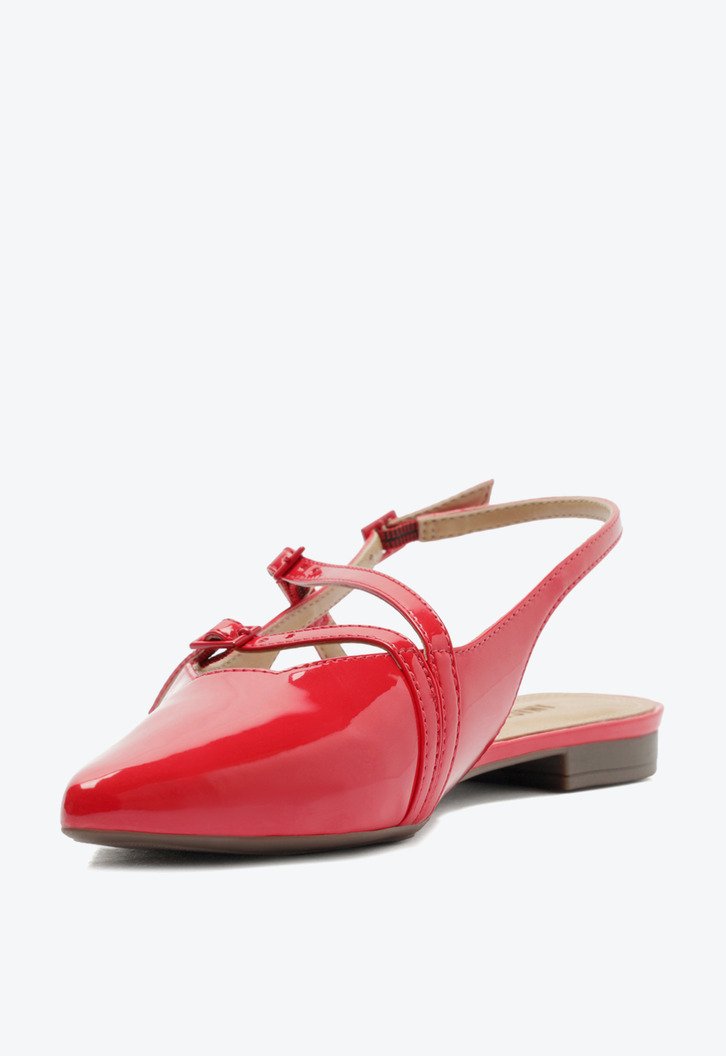 Sapatilha slingback em verniz de duas tiras, na cor vermelha. O modelo de bico fino possui solado rasteiro emborrachado, com leve saltinho traseiro. Feita em material similar ao couro com acabamento envernizado, traz fecho estilo slingback em fivela lateral, por tirinha que contorna o calcanhar. Com design imponente de recortes no cabedal, traz aplicação de duas tirinhas afiveladas laterais, sobre o peito de pé. Com palmilha nude e assinatura Anacapri.