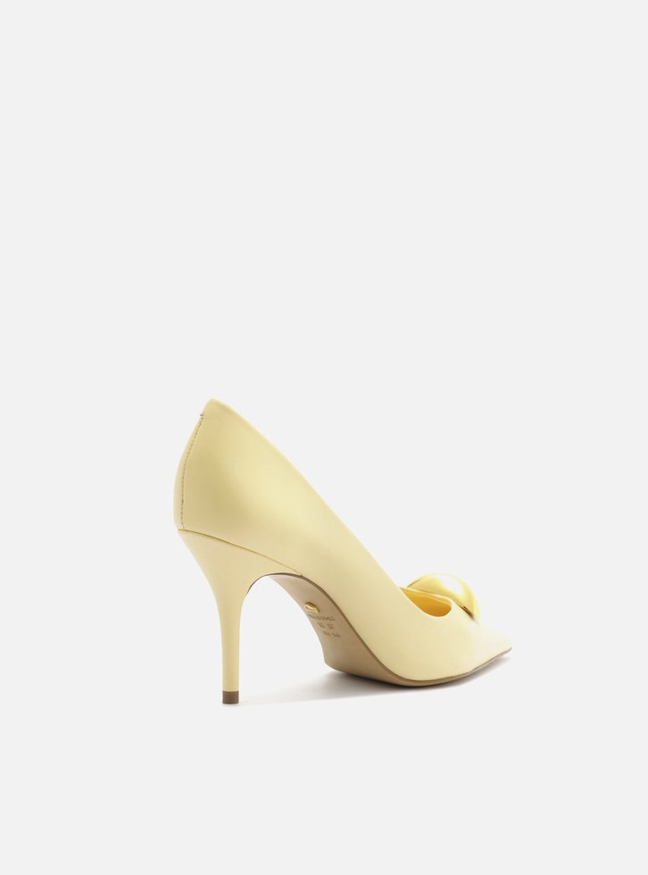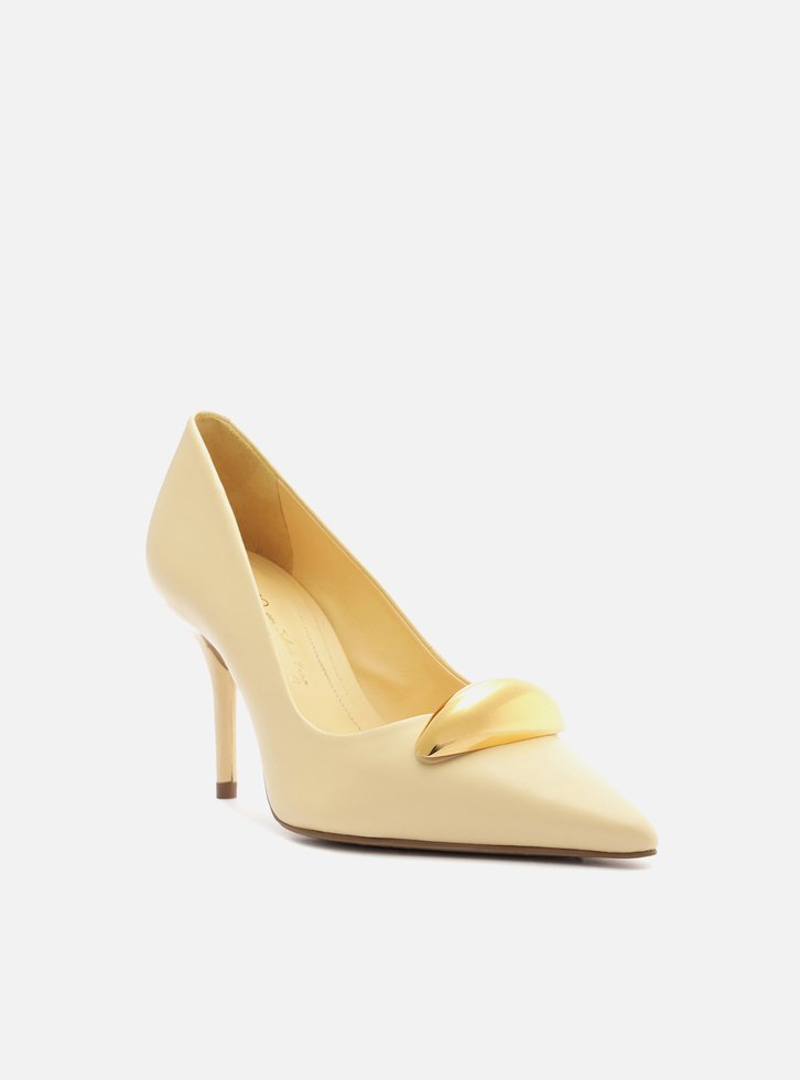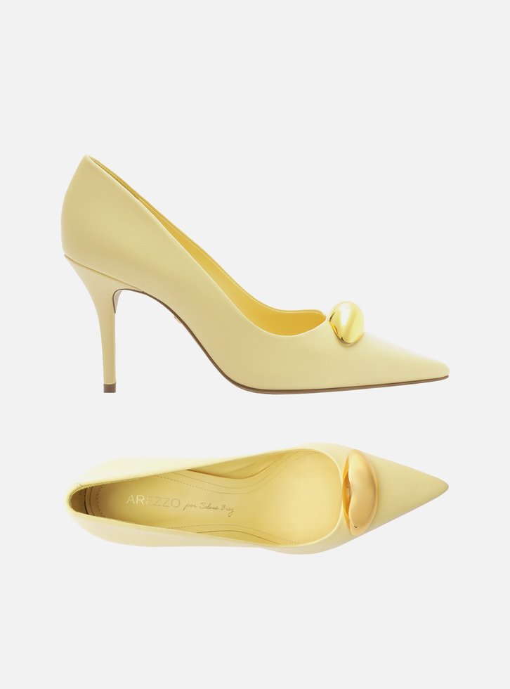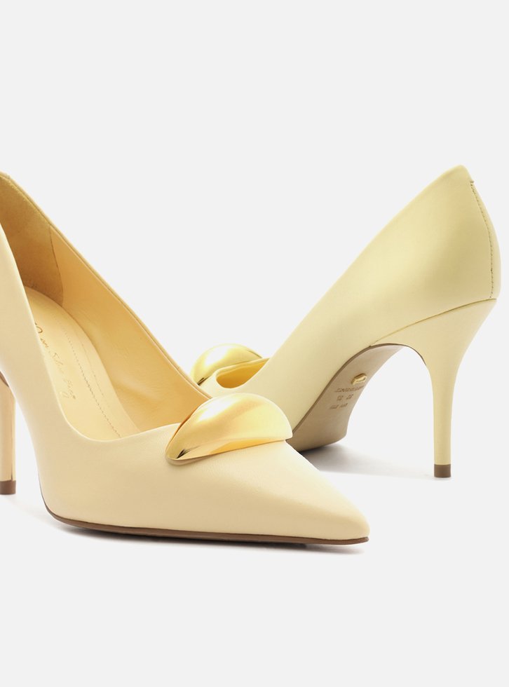 Scarpin amarelo de couro. O sapato tem salto médio fino e ponta fina. Fechado, traz cabedal com recorte arredondado sobre a parte superior do pé e aplicação de metal dourado, espesso e orgânico. Com palmilha da cor do sapato e inscrição do nome da marca, exibe toda a parte superior do pé.