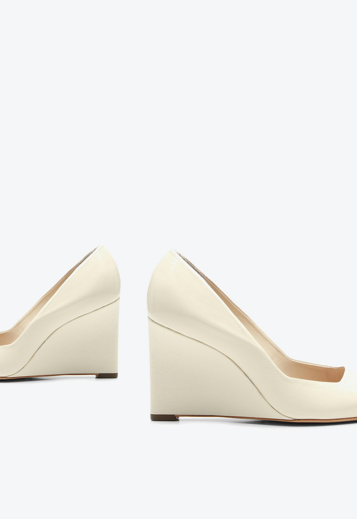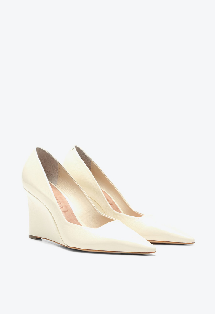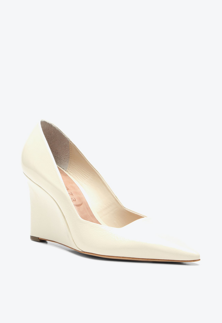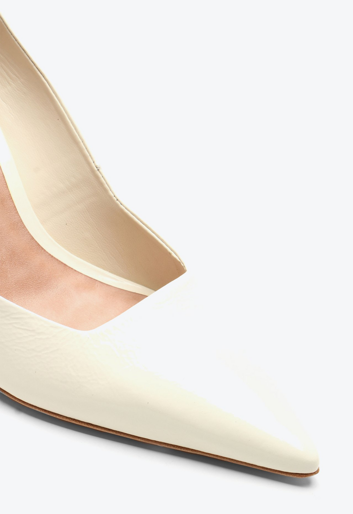 Scarpin bege de salto alto em verniz com bico fino. O toque sofisticado e autêntico que faltava na sua composição! Com o shape autoral VCZ, chegou com tudo para ser o protagonista do visual