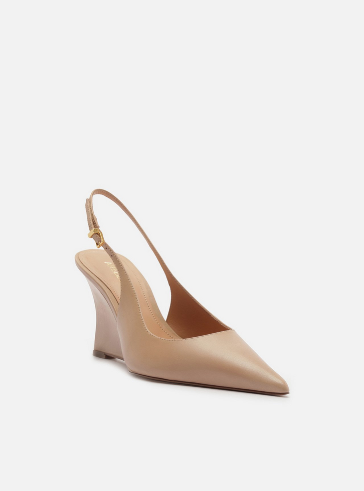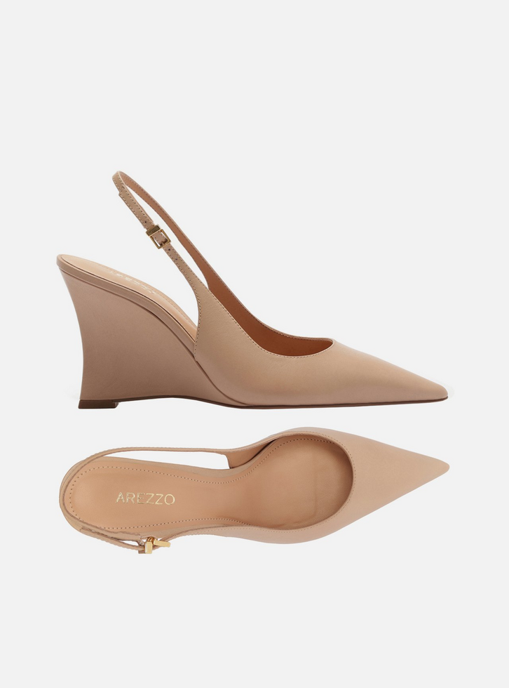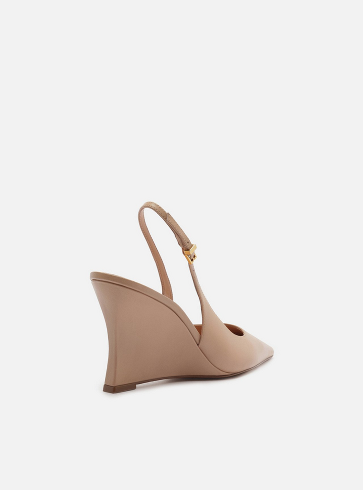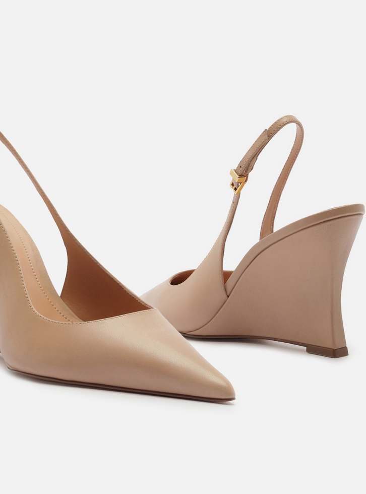 Scarpin feminino bege de couro. O sapato tem salto alto anabela e ponta fina. Traz cabedal com recorte arredondado sobre a parte superior do pé. Aberto, tem tira fina conectada ao cabedal que segue pelas laterais e contorna o calcanhar, com fivela metálica lateral. Com palmilha da cor do calçado e inscrição do nome da marca. Exibe parte do pé.
