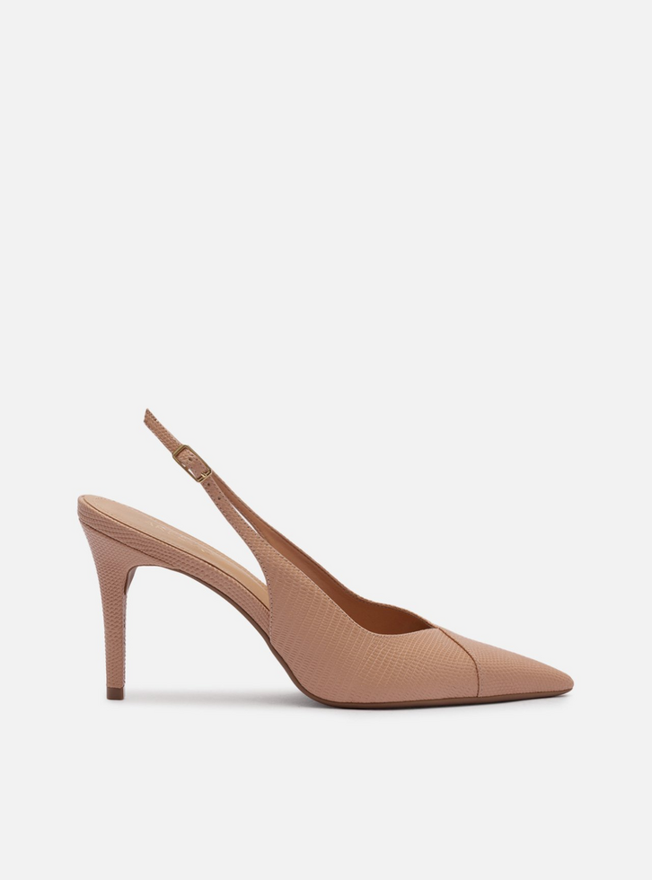 Scarpin bege em material texturizado lizard. O sapato tem salto médio fino e ponta fina. Fechado, traz cabedal com recorte em V sobre a parte superior do pé. Traz tira fina conectada ao cabedal que segue pelas laterais e contorna o calcanhar, fechando em fivela metálica. Com palmilha bege e inscrição do nome da marca.