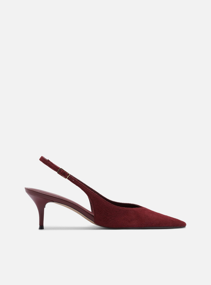 Scarpin bordô em camurça. O sapato tem salto baixo fino e ponta fina. Fechado, traz cabedal com recorte em V sobre a parte superior do pé. Traz tira fina conectada ao cabedal, que segue pelas laterais e contorna o calcanhar, com elástico. Com palmilha de couro da cor do calçado e inscrição do nome da marca.