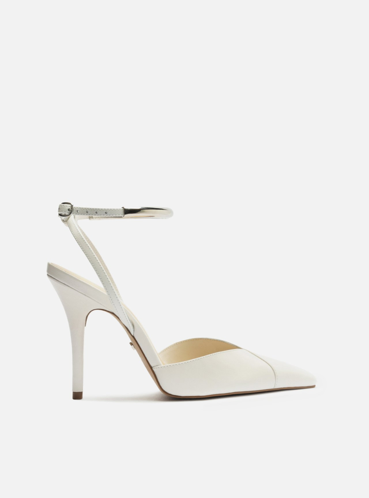 Scarpin branco de couro. O sapato tem salto alto fino e ponta fina. Traz cabedal com recorte em V sobre a parte superior do pé. Aberto, possui tira fina, com aplicação de metal, que sai das laterais, cruza no calcanhar, contorna o tornozelo e fecha em fivela lateral. Com palmilha bege e inscrição do nome da marca.