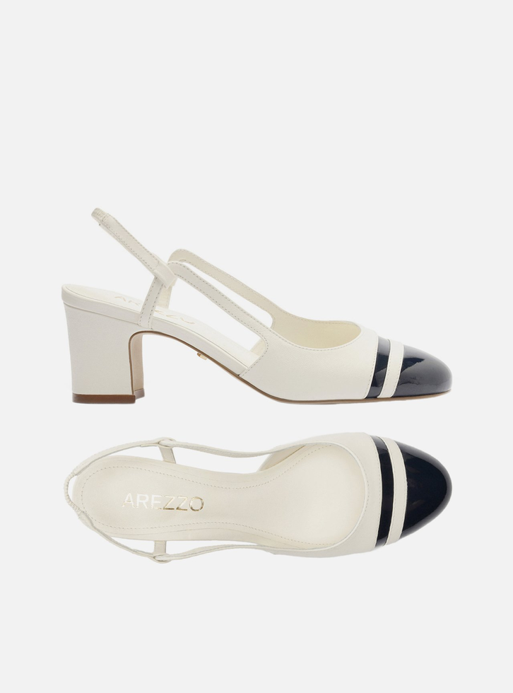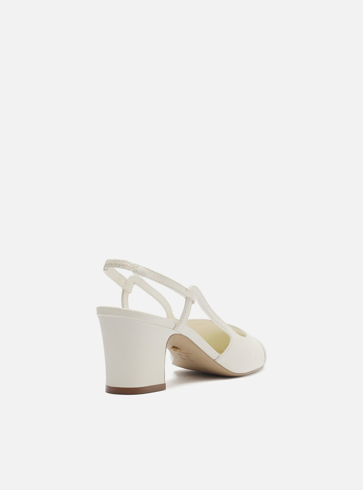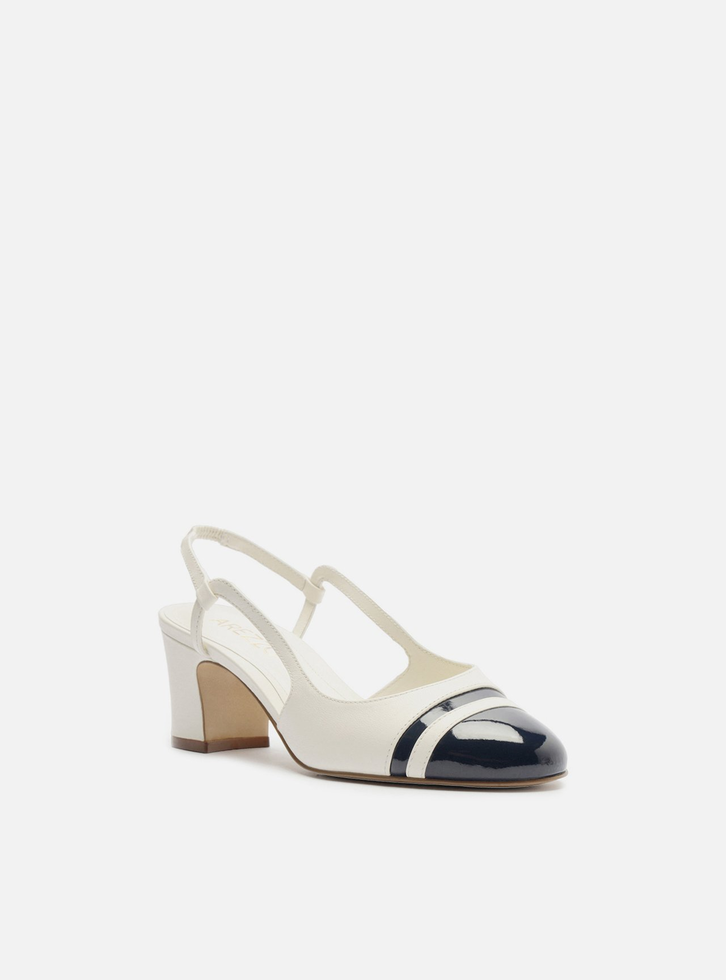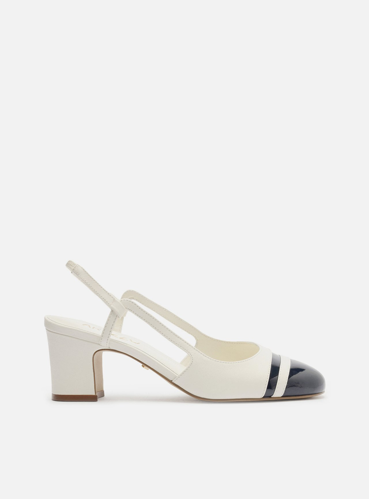 Scarpin branco de couro. O sapato tem salto médio bloco e formato arredondado na ponta. Aberto, traz cabedal com recorte arredondado e duas tiras que seguem pelas laterais, presas à tira em torno do calcanhar. Possui ponteira em verniz azul com detalhe em tira de couro branca sobreposta. Com palmilha da cor do sapato e inscrição do nome da marca.