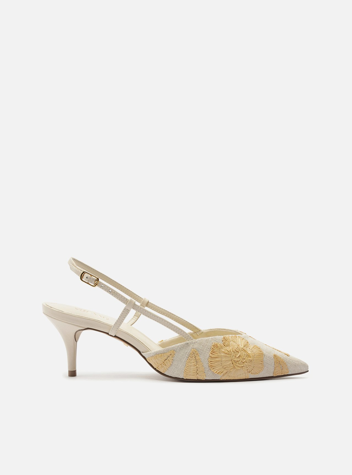 Scarpin branco. O sapato tem salto baixo fino, revestido em linho, e ponta fina. Fechado, traz cabedal em linho, com bordado floral em ráfia e recorte em V sobre a parte superior do pé. Possui tira fina conectada ao cabedal, que segue pelas laterais e contorna o calcanhar, com fecho em fivela lateral. Com palmilha branca e inscrição do nome da marca.