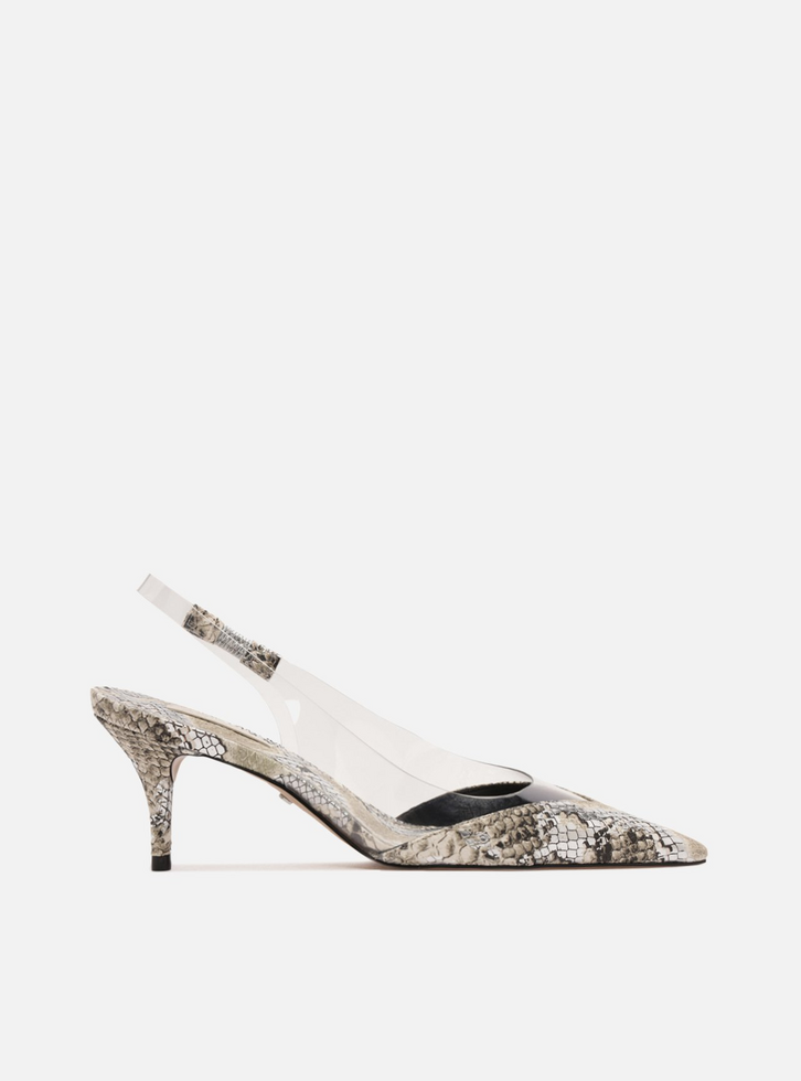Scarpin feminino cinza com recortes em vinil transparente. O modelo possui salto baixo fino e bico alongado. Conta com tira em vinil que envolve as laterais e calcanhar.